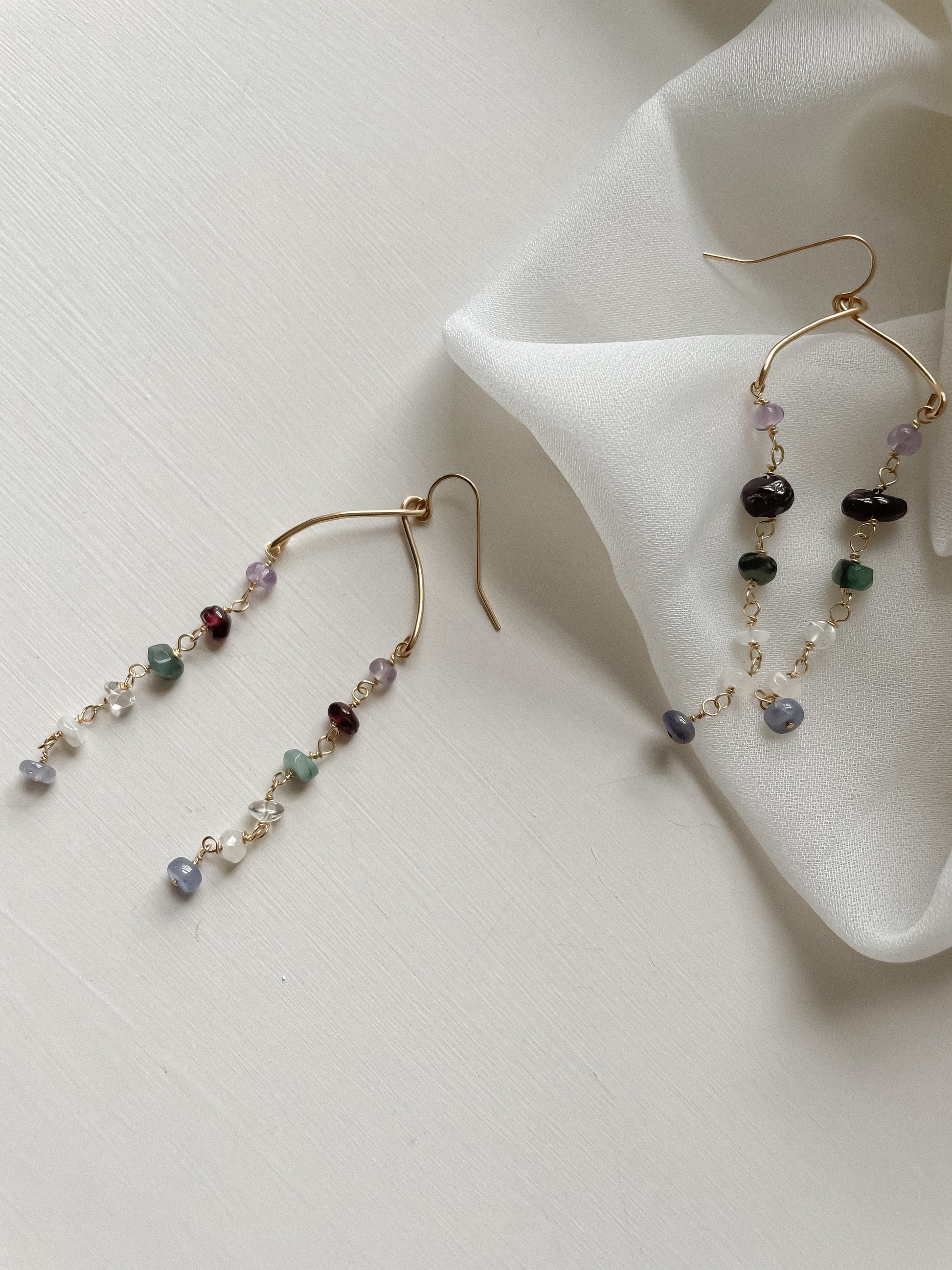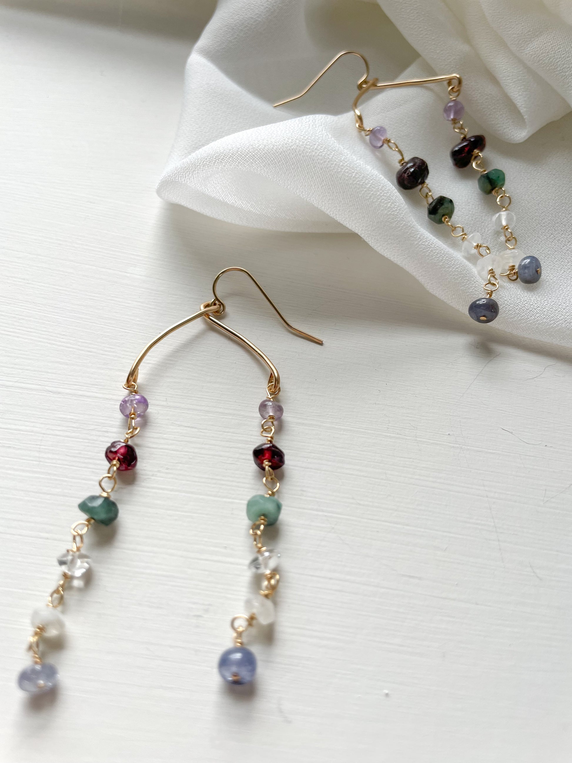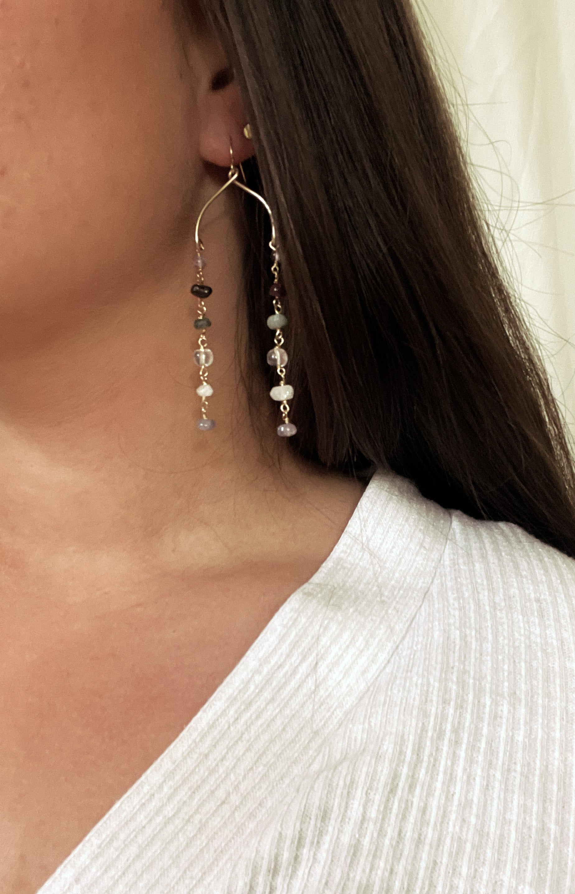 An eclectic and delicate look created in 14kt gold filled or sterling silver. Let these colorful chandeliers featuring amethyst, garnet, turquoise, quartz, moonstone, and labradorite brighten up your jewelry collection.