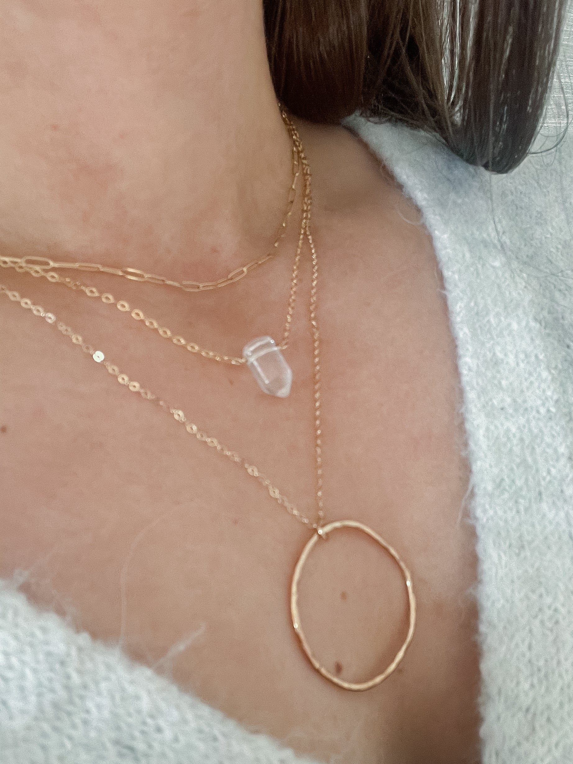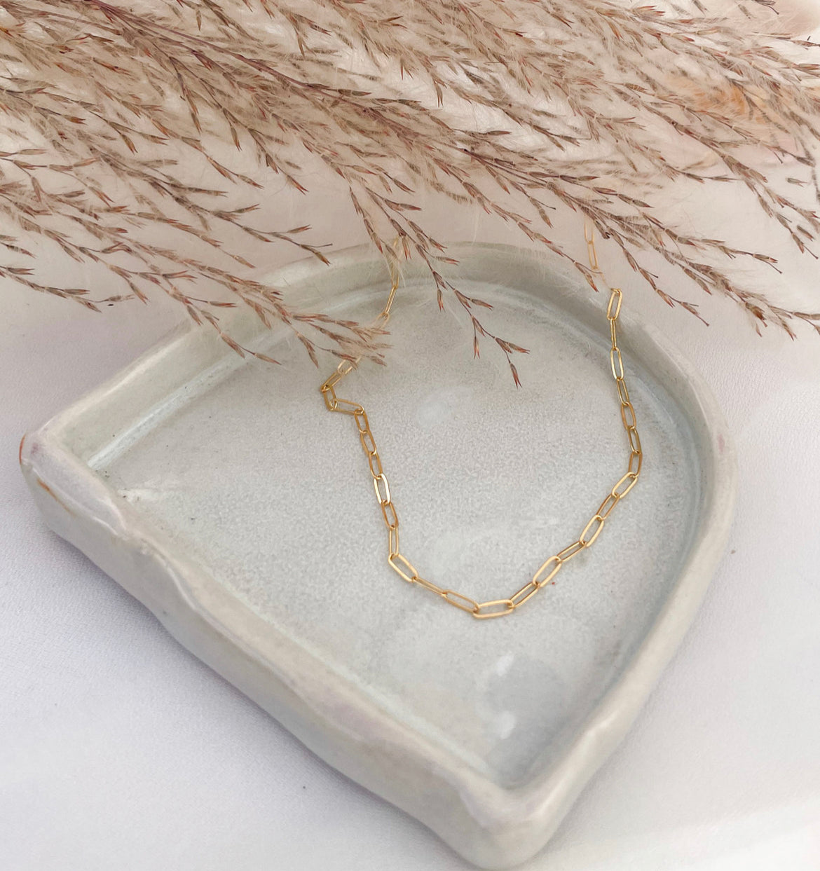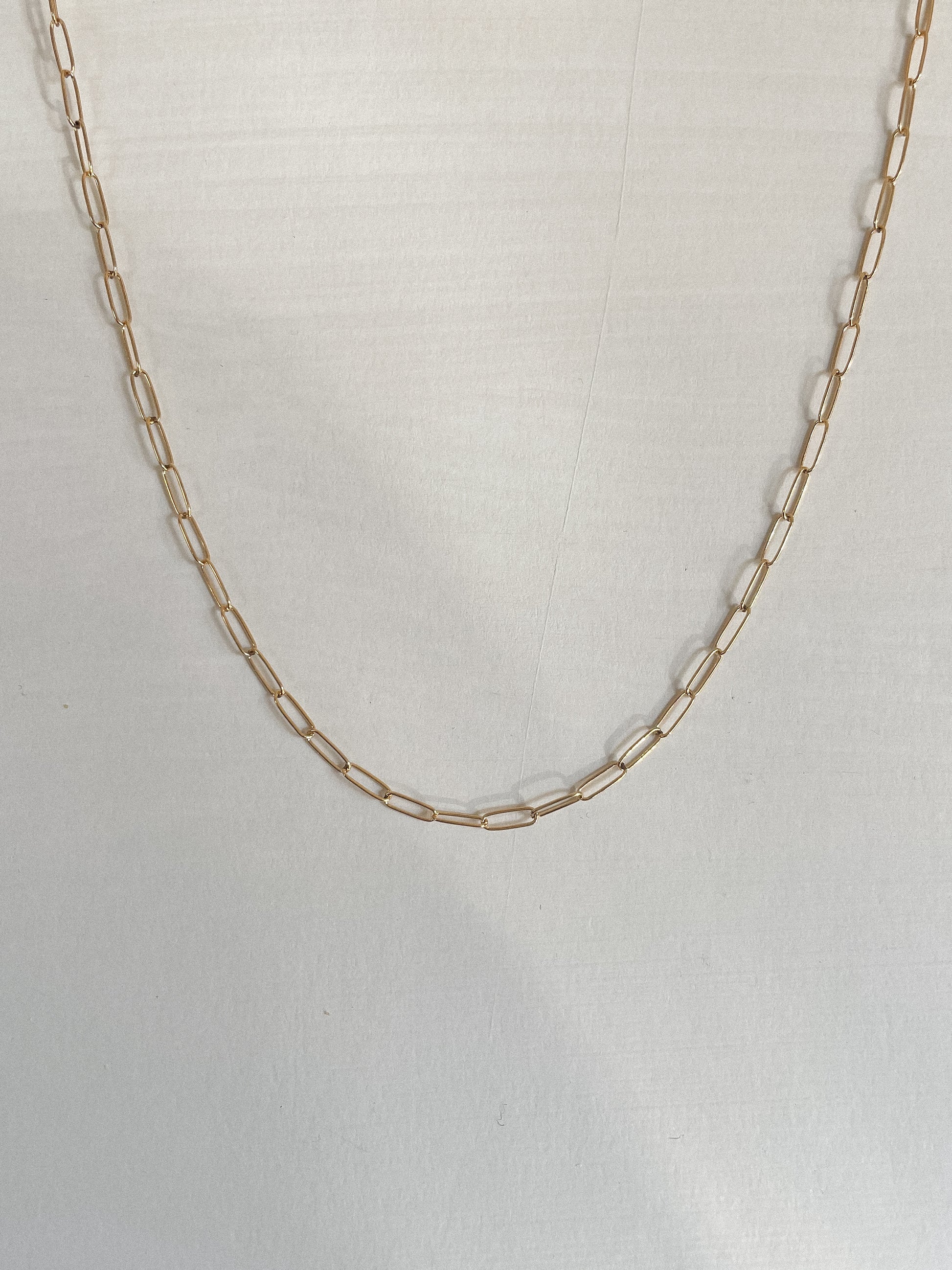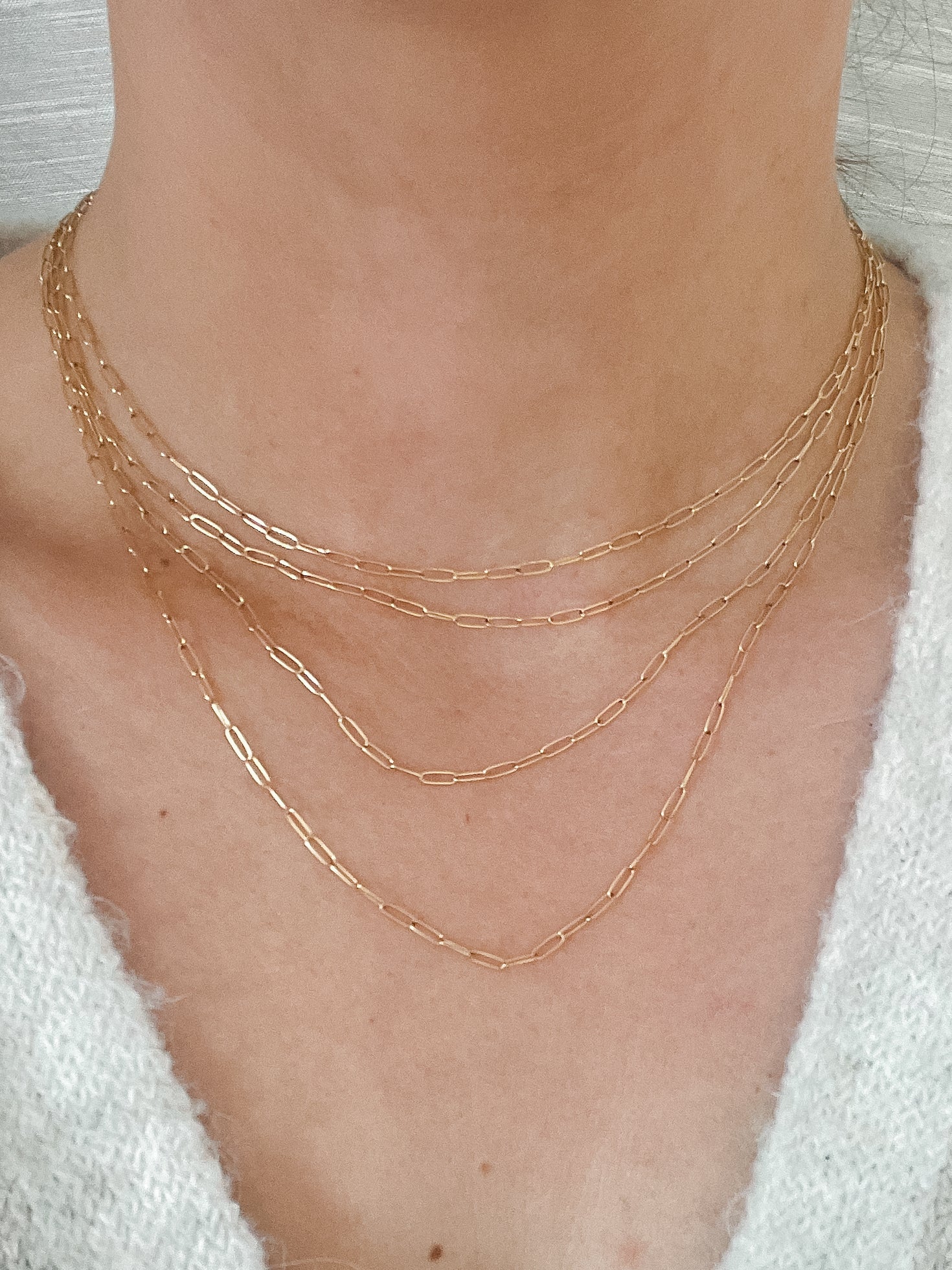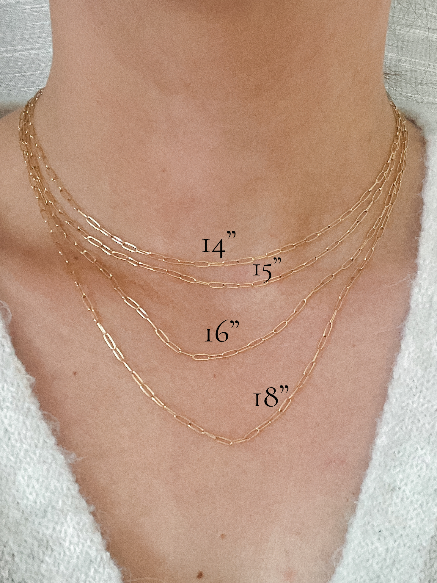 This chic paperclip chain is perfect for everyday wear. Delicate but strong enough to stand up to my infant’s surprisingly strong grip-and-yank tactic. It can be worn on its own or layered with other necklaces. Our best selling necklace, it's so good you never have to take it off!