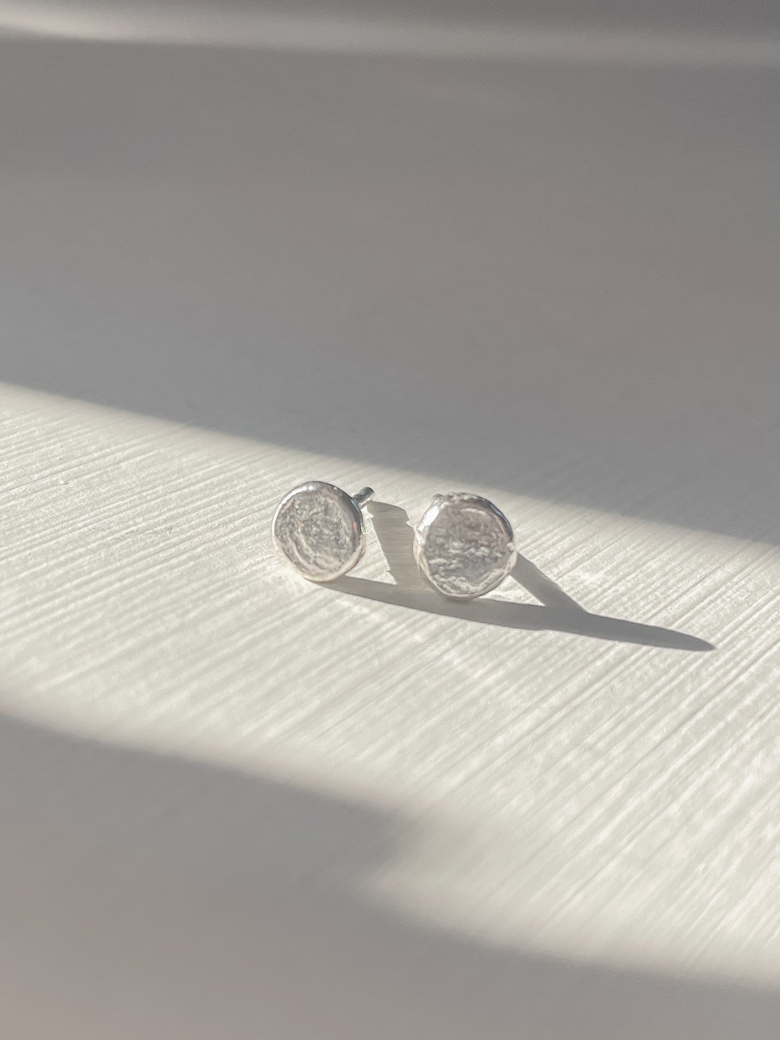 A classic sterling silver stud with character. These studs are crafted from recycled sterling silver melted down in the Yale Street Jewelry studio. Each stud is slightly different and perfectly imperfect. Enjoy knowing that they are made with recycled scraps from our studio.