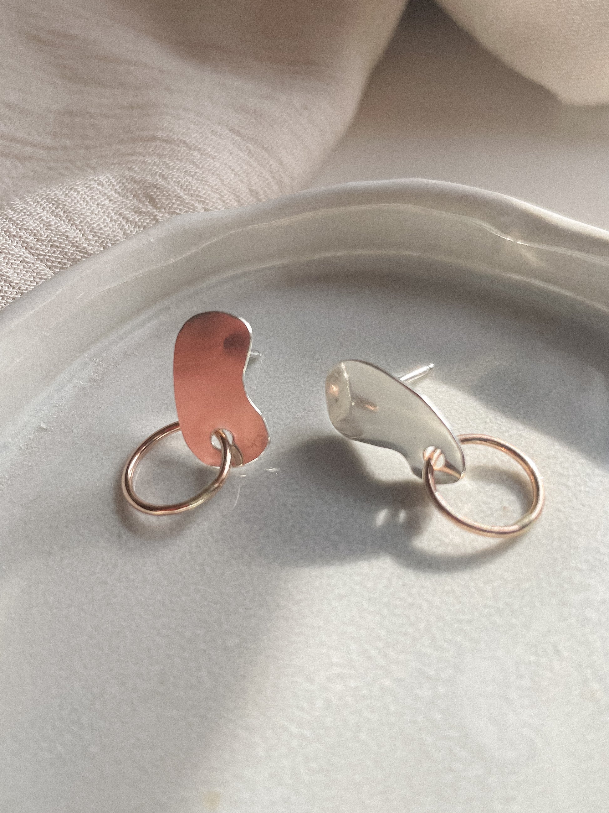 Shaped like a yin and yang. Hand cut sterling silver studs with a 14kt gold filled loop woven through. This earring is a beautiful way to bring in mixed metals. The studs are small and understated to make a subtle statement.