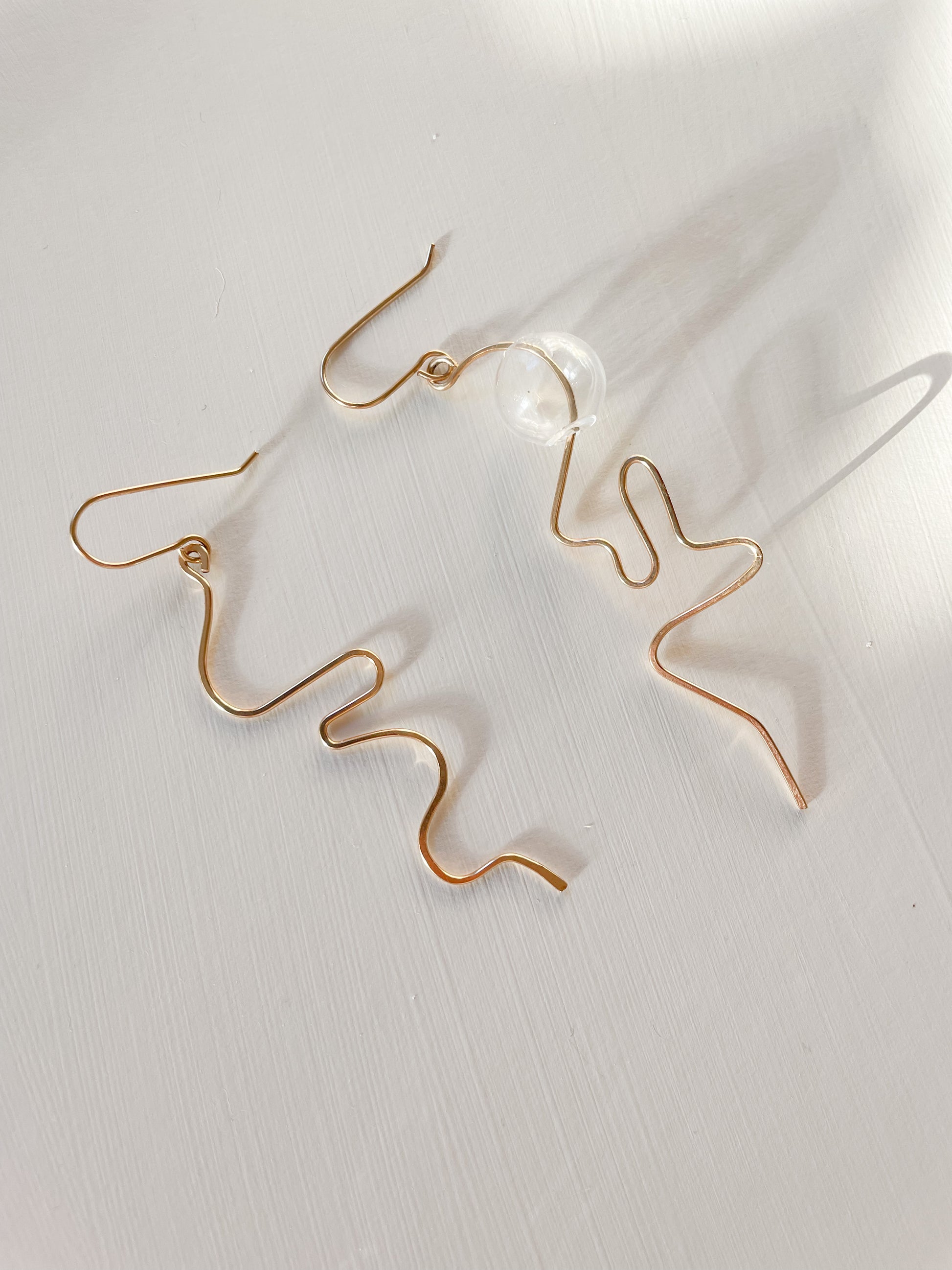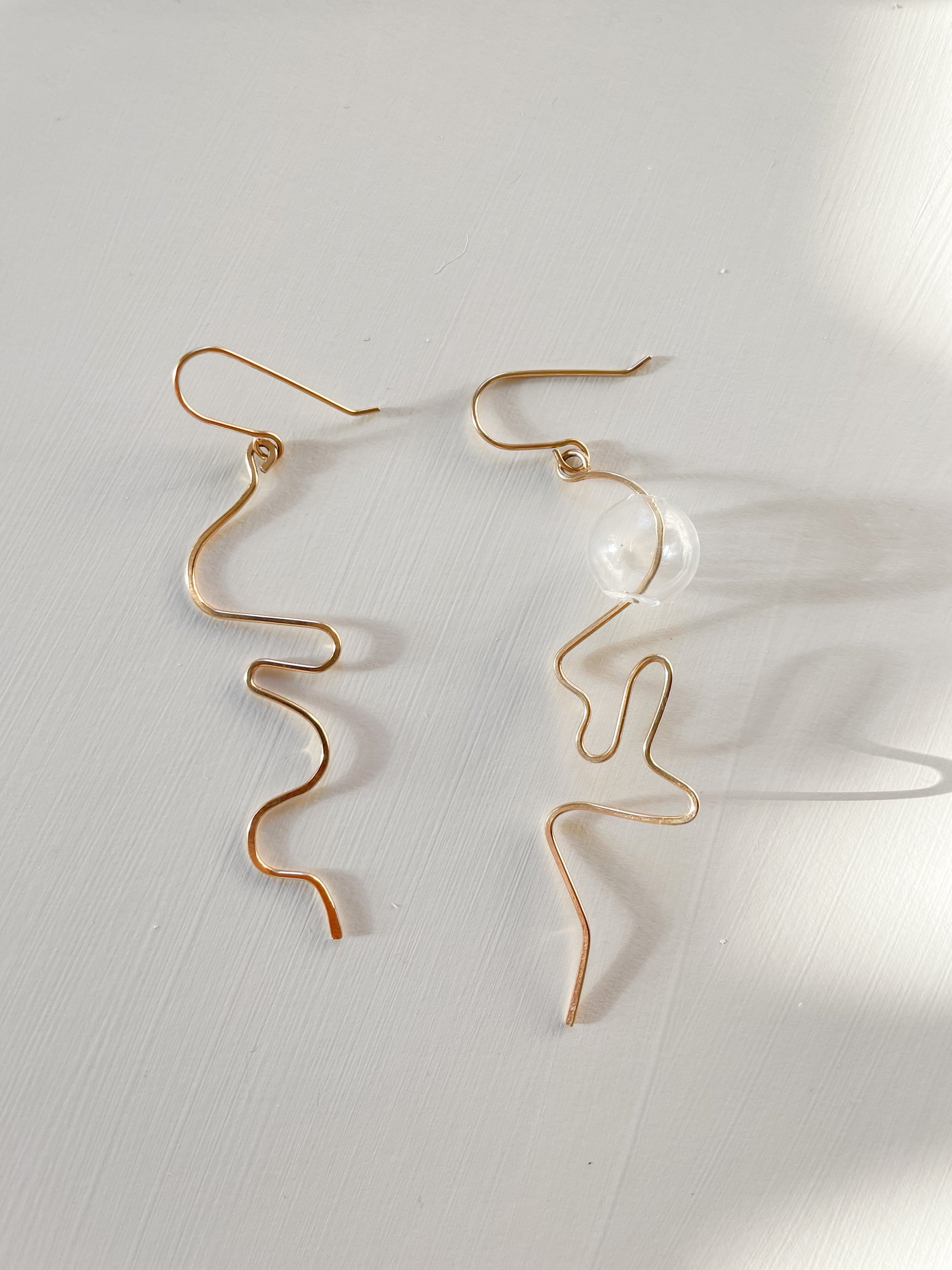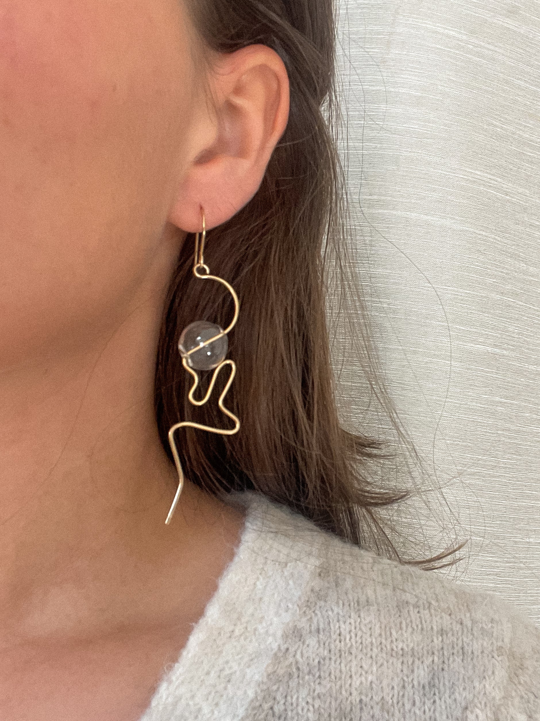The earrings that inspired our logo! These asymmetric earrings balance character and elegance, featuring a hand blown glass bead on 14kt gold filled or sterling silver wire.