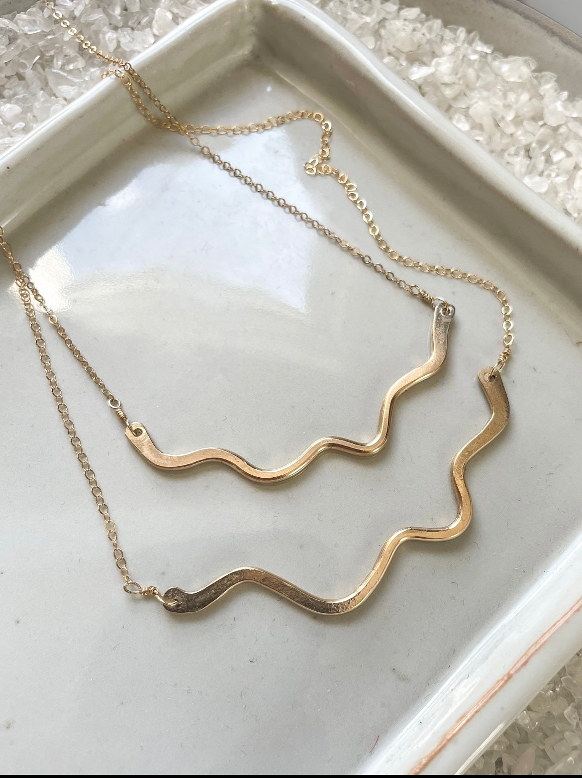 Note: picture shows two necklaces together. This listing is for a single necklace. This beautiful Wave Necklace is the perfect way to make a statement! Crafted with 14K gold filled, it features an elegantly hand-formed and hammered squiggle organic shape on a 16” gold fill chain. Perfect for jazzing up any outfit!
